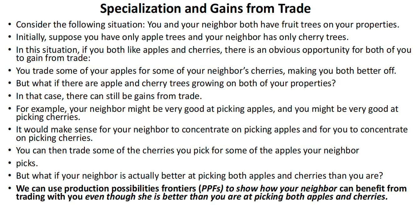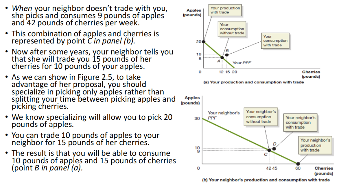 Example: By specializing in apple picking and trading for cherries, you and your neighbor both benefit from increased efficiency.
