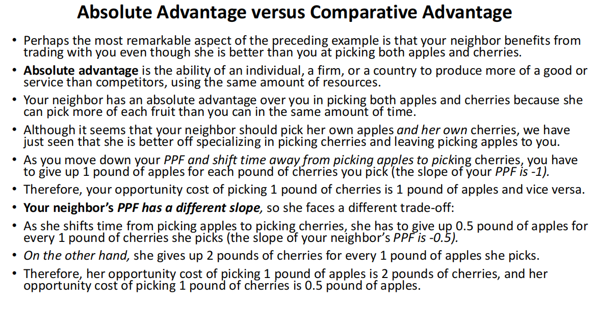 (例如,尽管你的邻居在采摘苹果和樱桃方面具有绝对优势,但由于她在采摘樱桃时的机会成本较低,她在采摘樱桃方面具有比较优势。)
