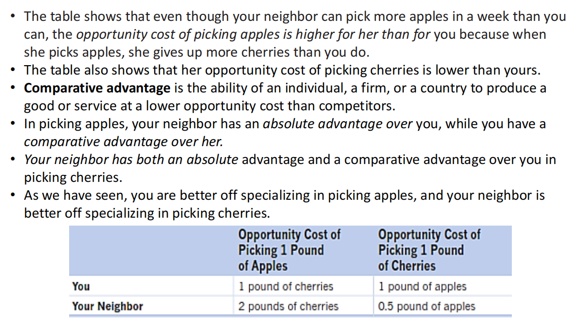 Example: Your neighbor’s opportunity cost of picking apples is higher than yours because she gives up more cherries than you when picking apples.