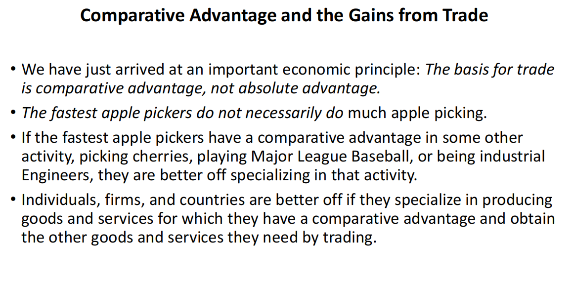 (贸易基于比较优势,意味着专注于在较低机会成本下做自己最擅长的事。)