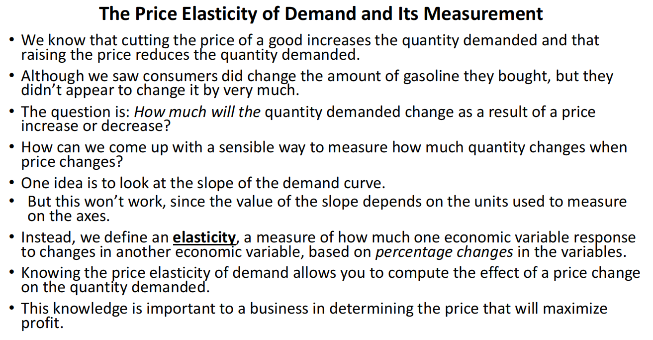 Instead, we define an elasticity, a measure of how much one economic variable responds to changes in another economic variable, based on percentage changes in the variables.