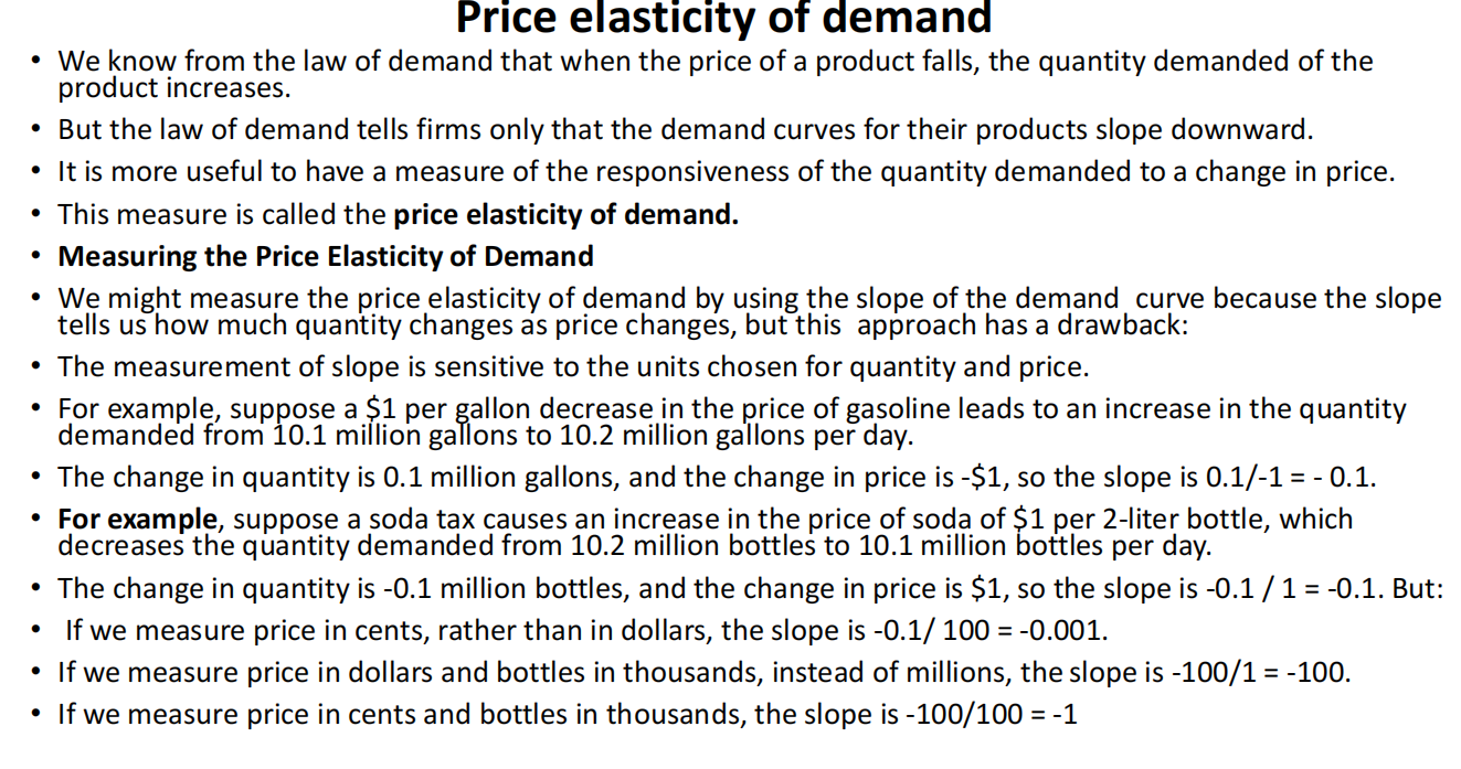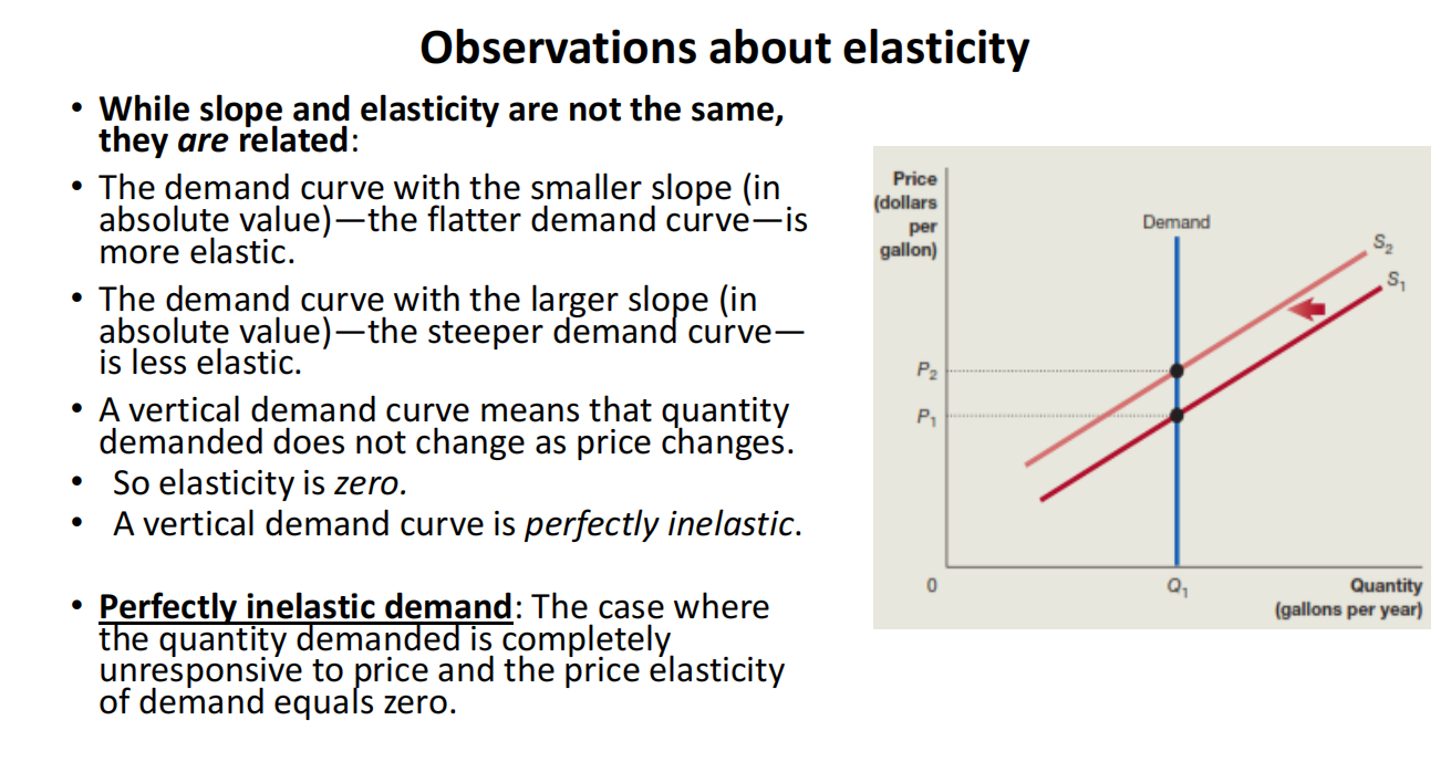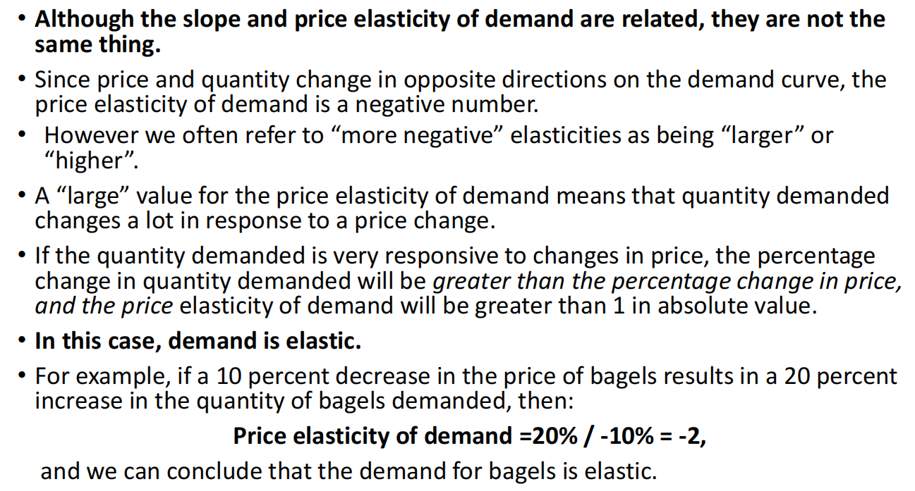 While slope measures the rate of change in price relative to quantity, elasticity measures the percentage change in quantity relative to price.