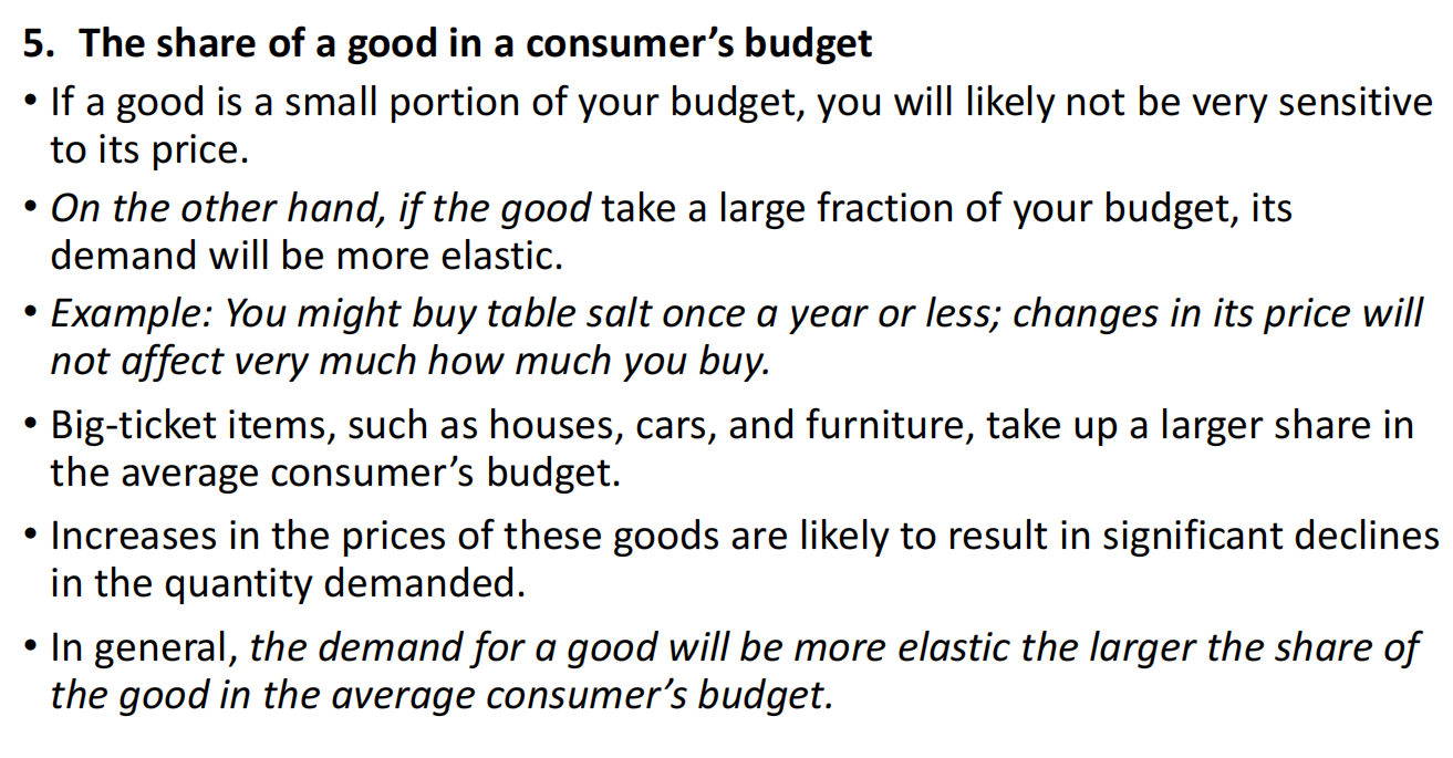 Goods that take up a larger share of a consumer’s budget tend to have higher elasticity.