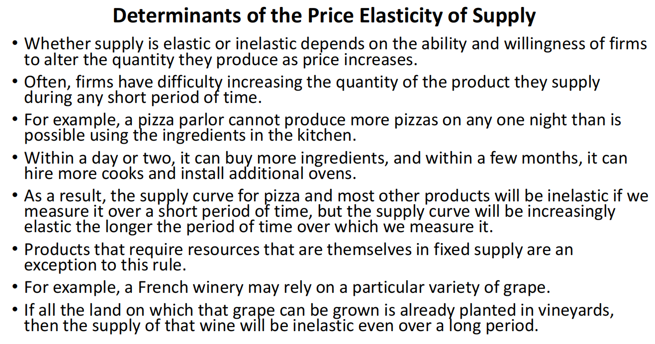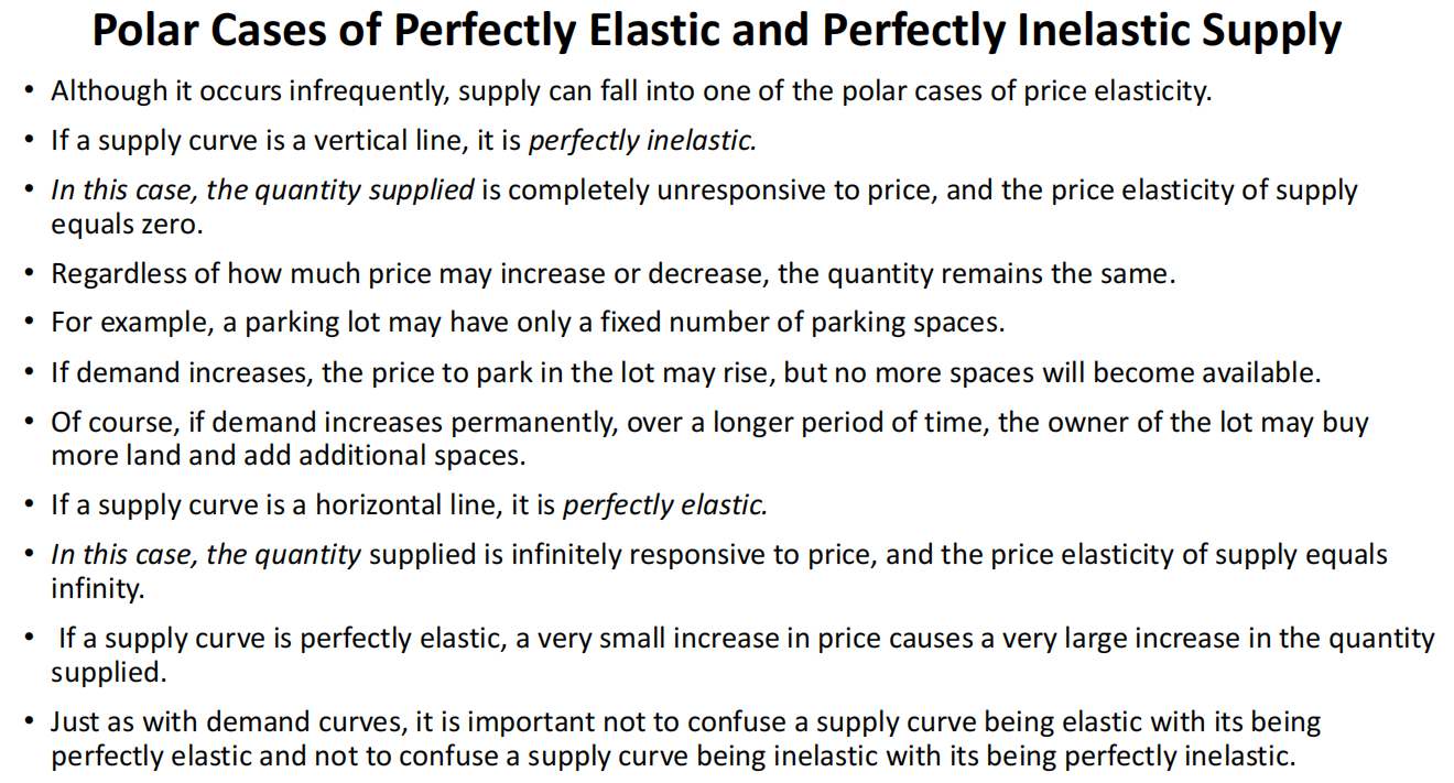 • Just as with demand curves, it is important not to confuse a supply curve being elastic with its being perfectly elastic and not to confuse a supply curve being inelastic with its being perfectly inelastic.