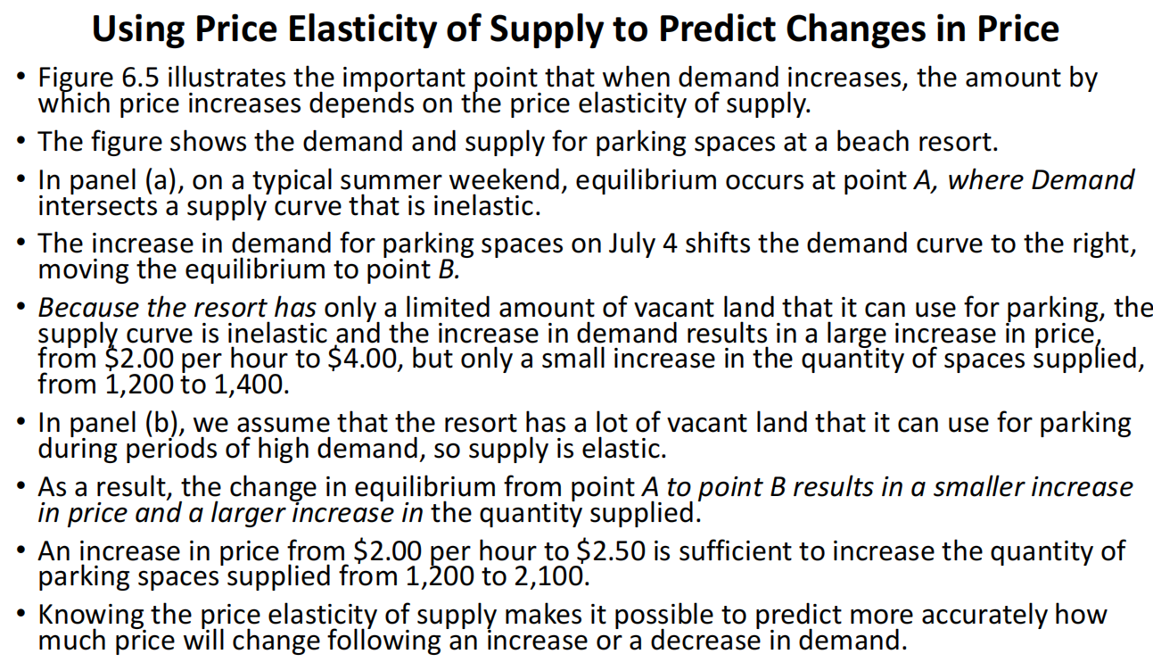 • Figure 6.5 illustrates the important point that when demand increases, the amount by which price increases depends on the price elasticity of supply.