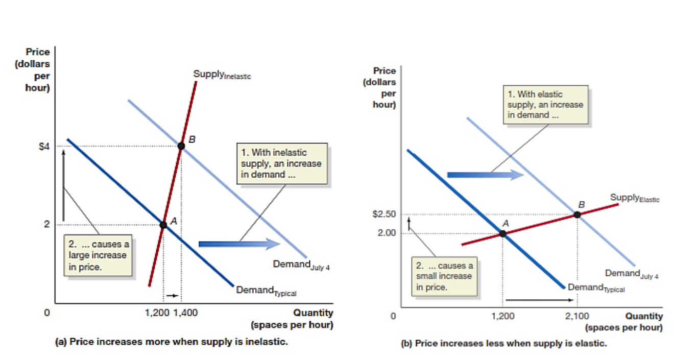 • Because the resort has only a limited amount of vacant land that it can use for parking, the supply curve is inelastic and the increase in demand results in a large increase in price, from 4.00, but only a small increase in the quantity of spaces supplied, from 1,200 to 1,400.